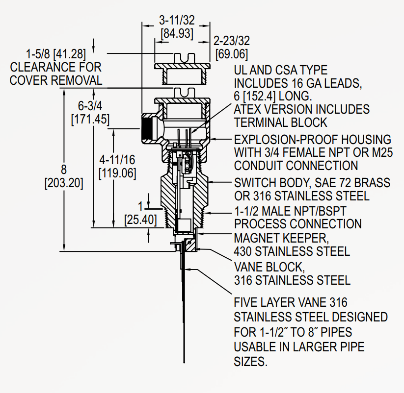| نوع سوئیچ | سوئیچ SPDT استاندارد، سوئیچ ضربه محکم و ناگهانی DPDT اختیاری است | اتصال فرآیند | 1-1/2˝ NPT مرد یا 1-1/2˝ BSPT مرد |